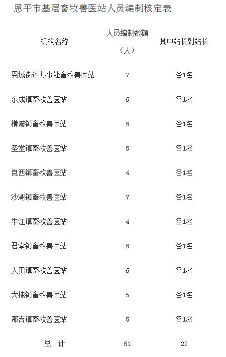 基层畜牧兽医站总编制核定61名,人员经费(市、镇两级财政各负责50%)由财政核拨,设站长11名、副站长11名。具体人员编制情况见下表。