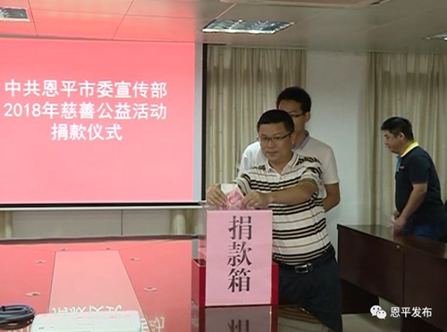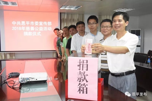 为弘扬乐善好施、扶危济困的中华民族传统美德,12日下午,市委宣传部举办2018年慈善公益捐款活动。全体机关干部积极响应市慈善会号召,踊跃捐款,以实际行动为我市困难群体奉献爱心,助力我市慈善公益事业发展。当天,宣传部全体机关干部共捐款2700元。