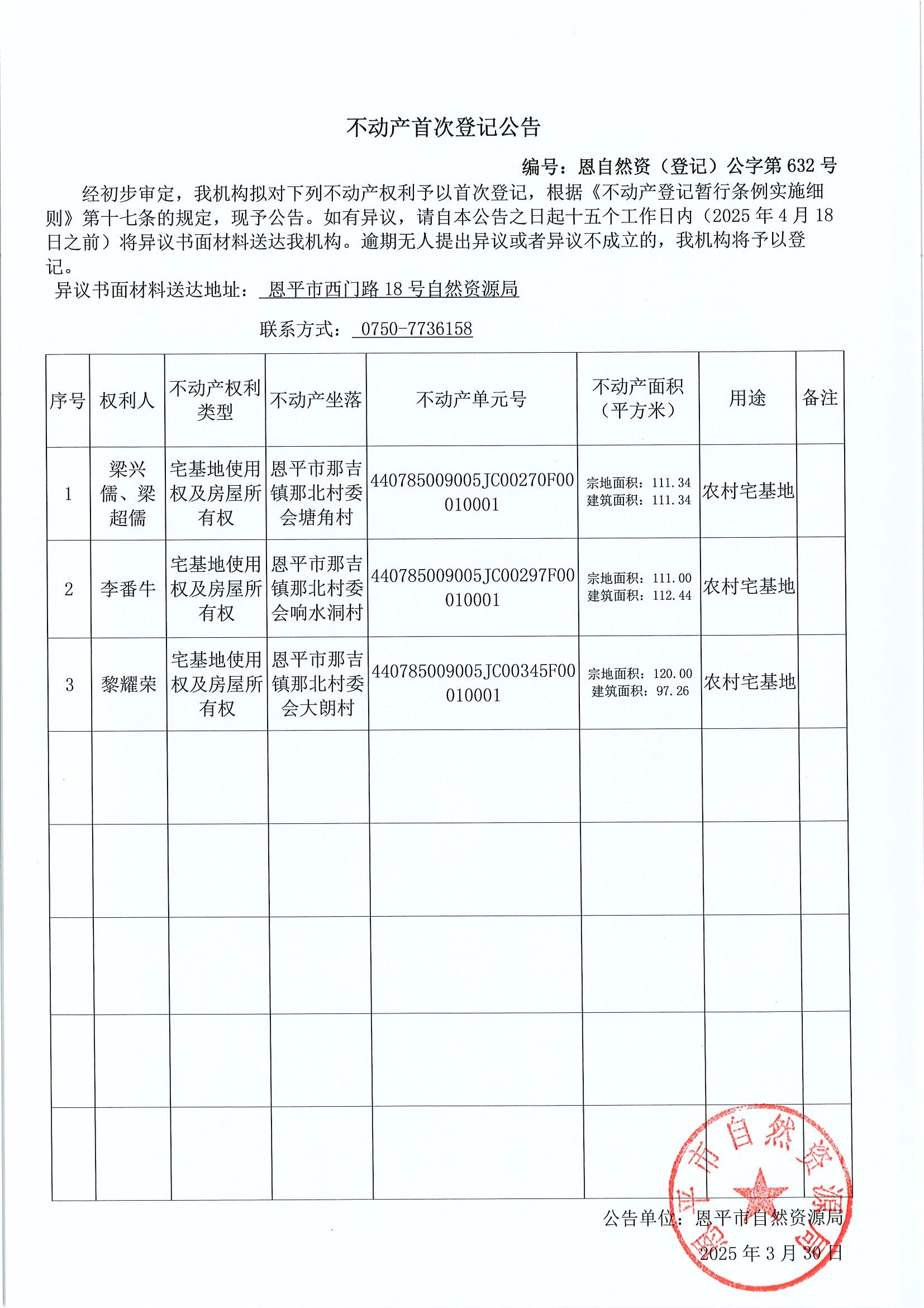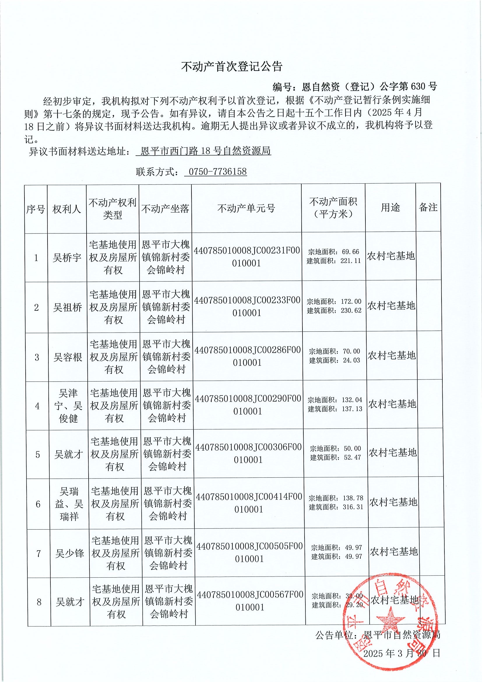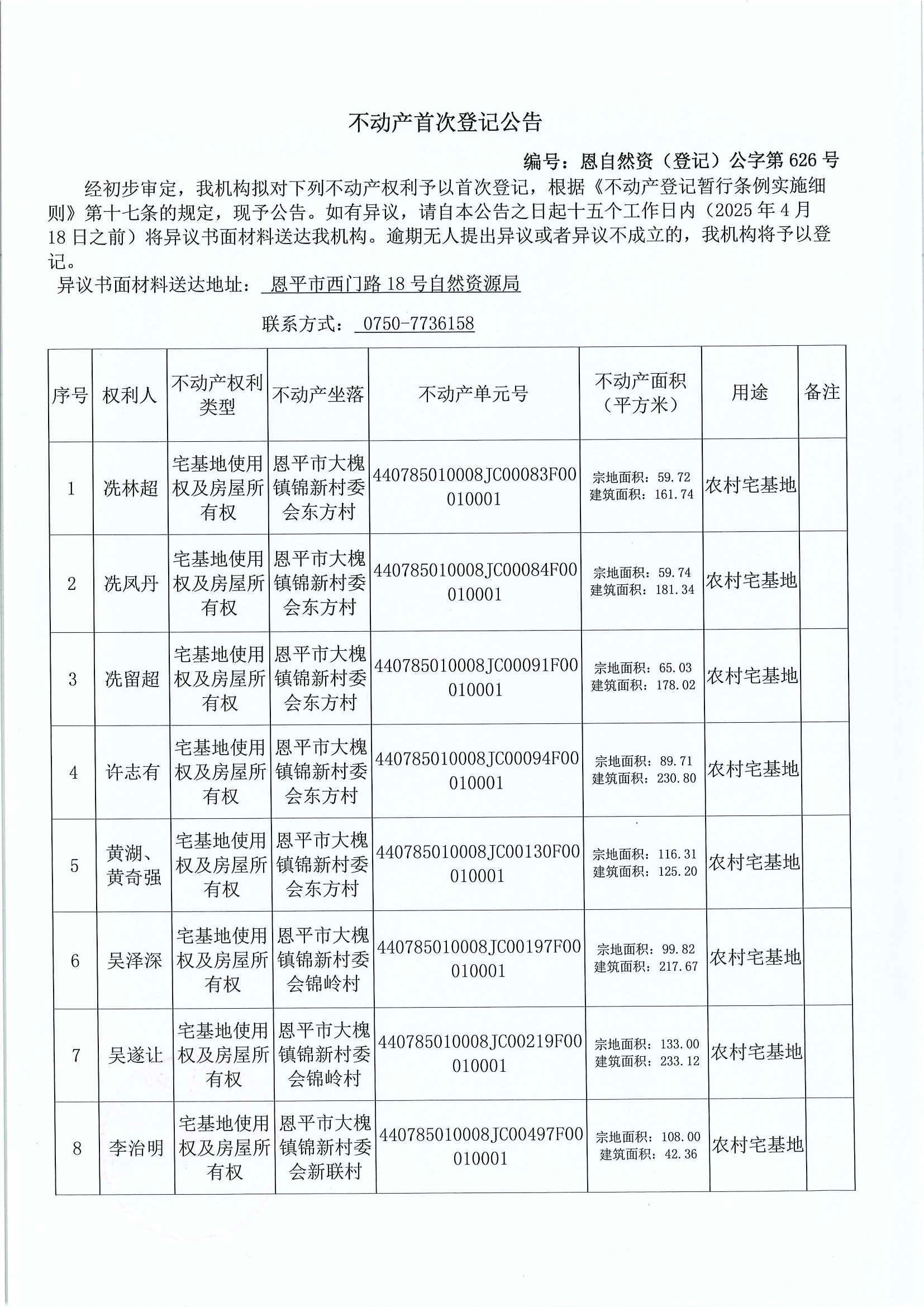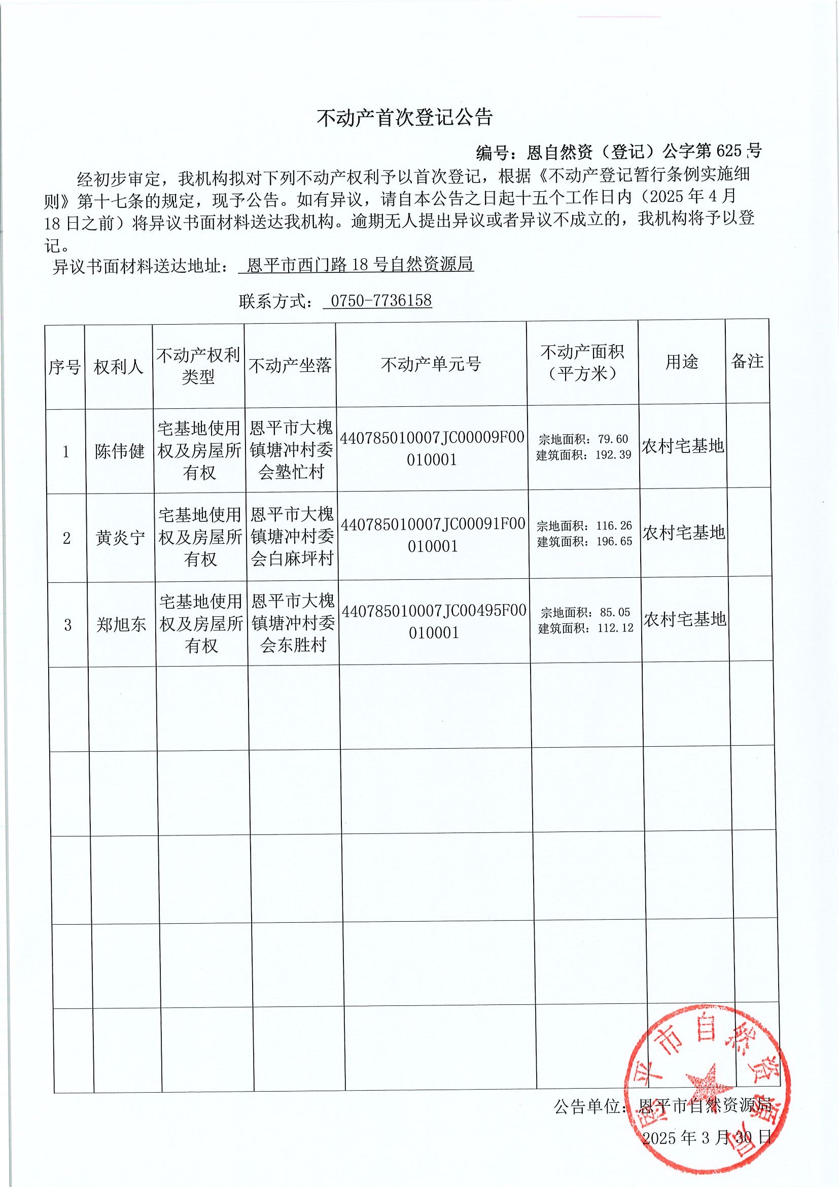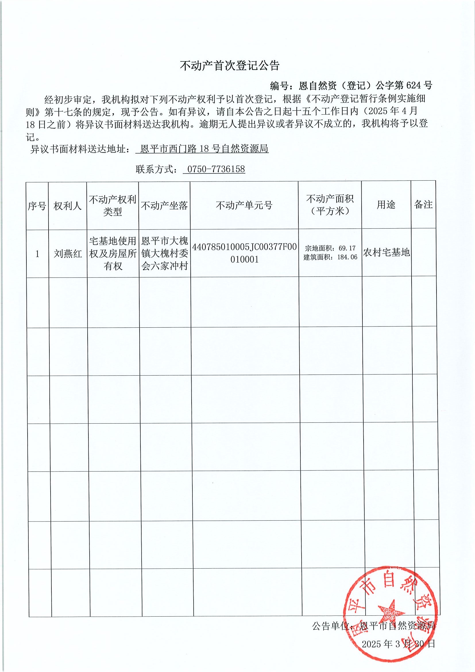 不动产首次登记公告-恩自然资(登记)公字第624-632号
