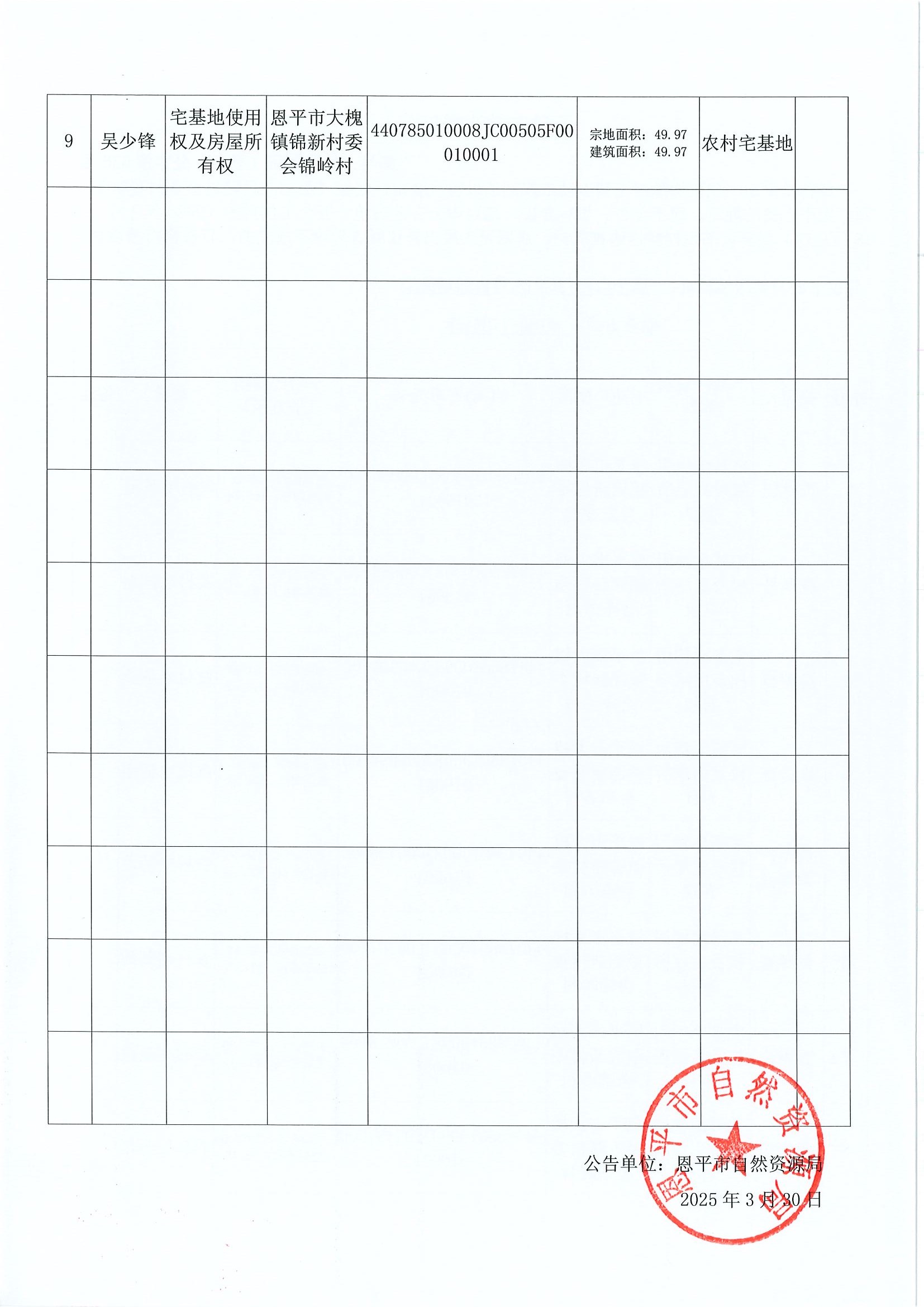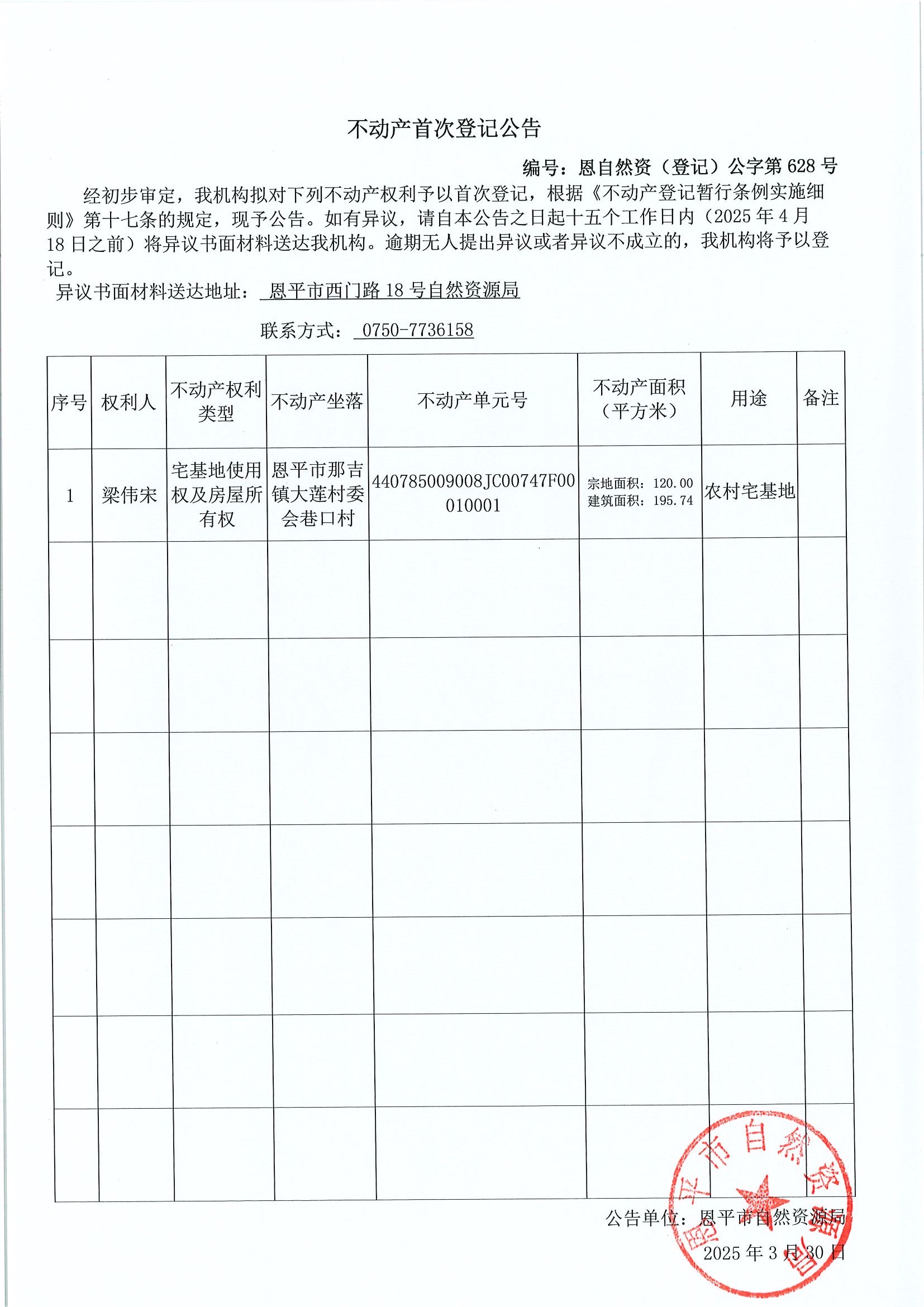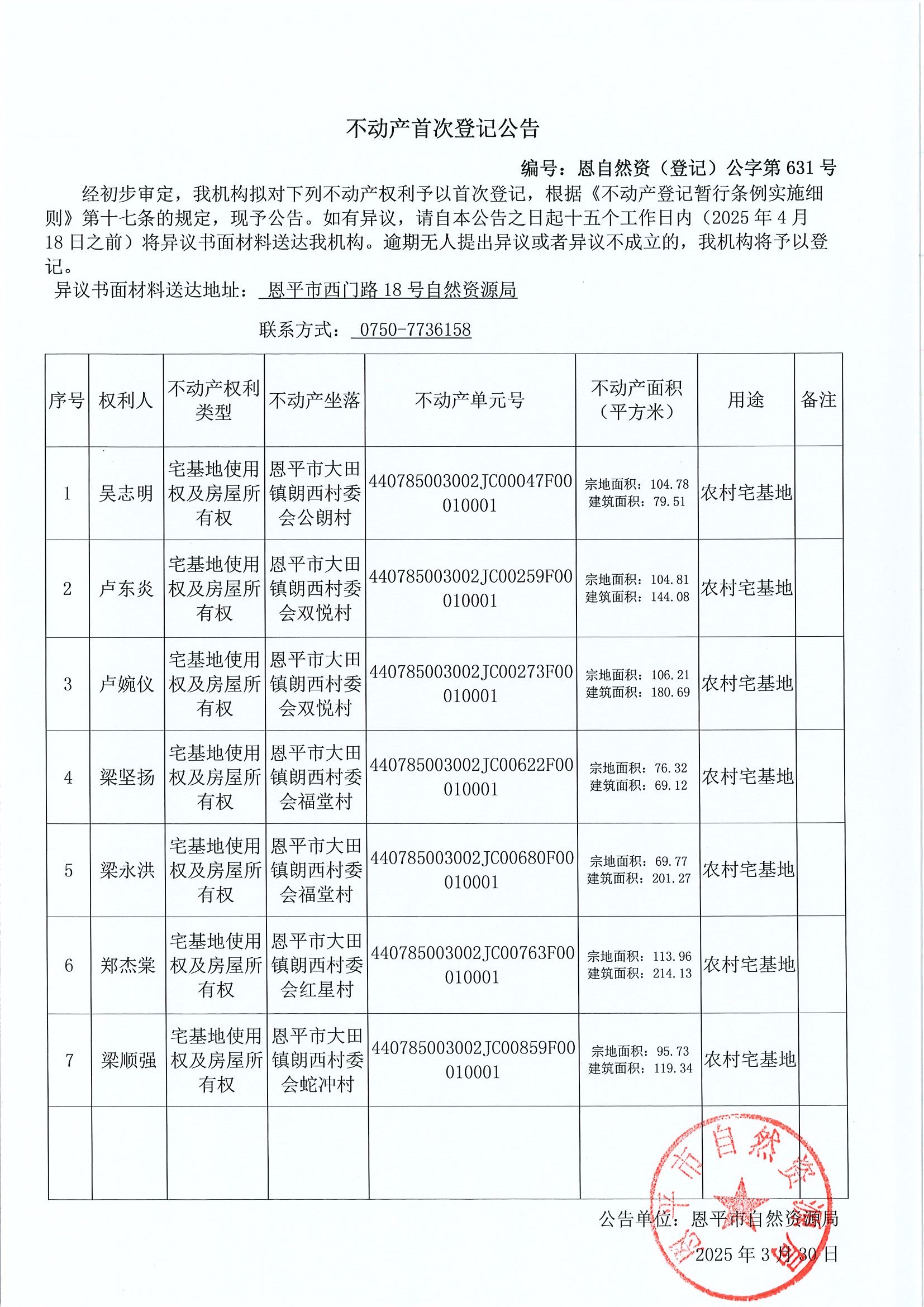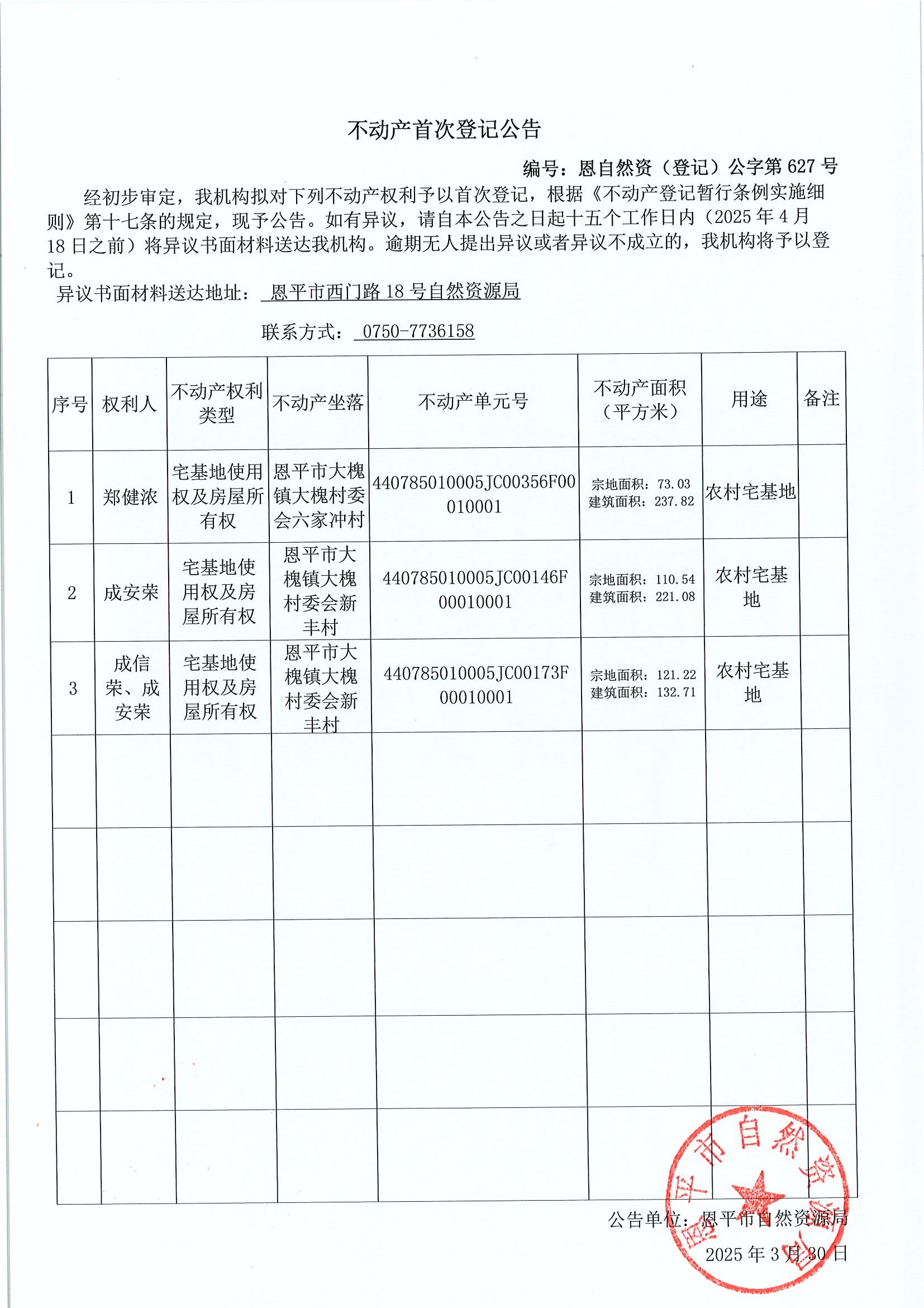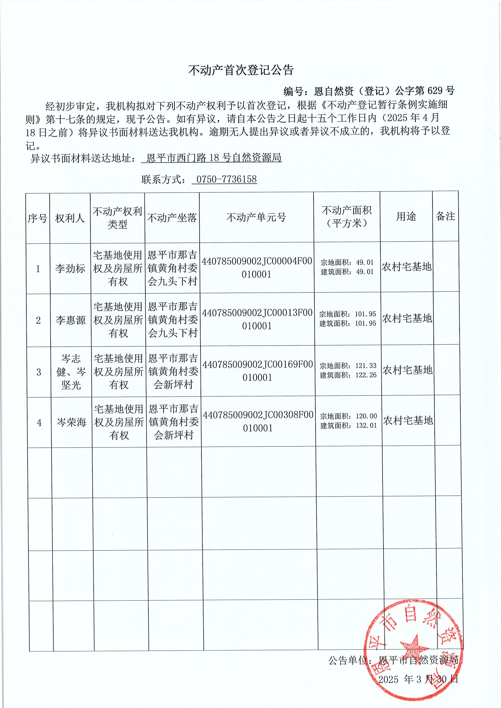 不动产首次登记公告-恩自然资(登记)公字第624-632号