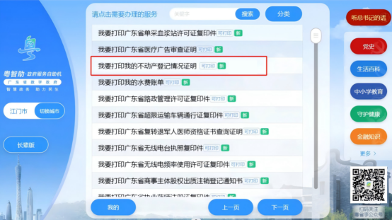 第一步:进入“粤智助”界面,下拉或搜索找到【我要打印我的不动产登记情况证明】,点击进入。
