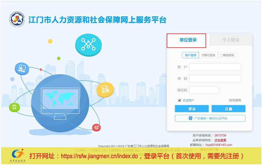 1.打开网址:https://rsfw.jiangmen.cn/index.do登录平台,首次使用需要先注册。