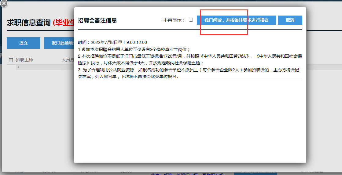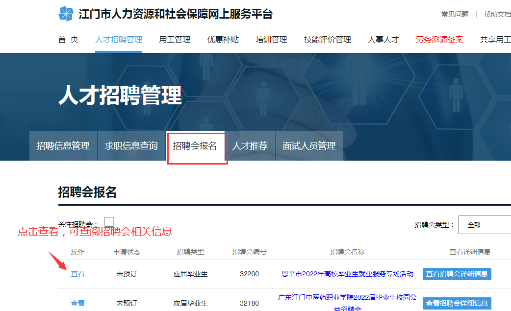 招聘信息发布审核通过后——点击“招聘会报名”——“查看”——“我已阅读,并按备注要求进行报名”——选择需要参加招聘会岗位,点击“提交”;