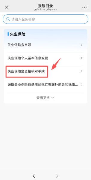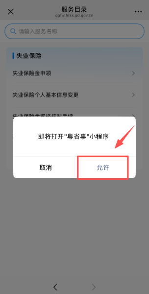 第二步:进入“失业保险”页面,点击“失业保险金资格核对手续”。点击“允许”跳转办理页面。
