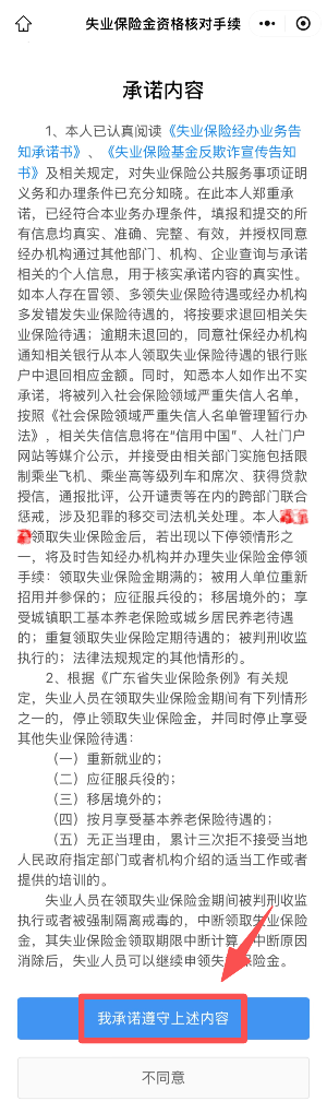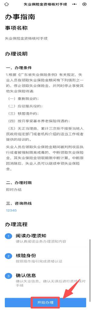 第三步:完成授权登录后,进入“失业保险金资格核对手续”页面。在办理页面,阅读办事指南后,点击页面下方“开始办理”,按操作指引确认“承诺内容”。