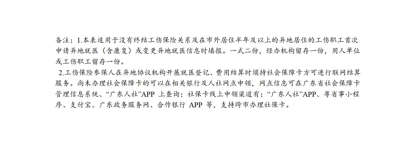 工伤异地居住就医:适用于没有终结工伤保险关系及在市外居住半年及以上的异地居住的工伤职工或长期驻外工作的工伤职工。工伤职工可将居住地所属地级以上市范围内的协议机构作为其异地就医医疗机构,填写《广东省工伤职工异地居住(就医)备案表》(详见附件2),居住地为户籍所在地的,提供有关户籍证明;非户籍所在地居住半年及以上的,提供居住地所属公安机关出具的居住证或居住地所属社区(村)委会出具的居住证明材料;异地工作的,需提交劳动合同或单位出具的派驻证明,报参保地经办机构备案。长期备案情形变动的,工伤职工应当及时向参保地经办机构办理变更。