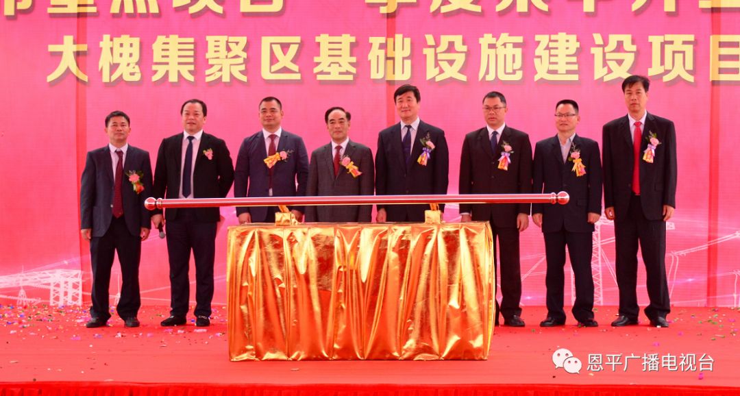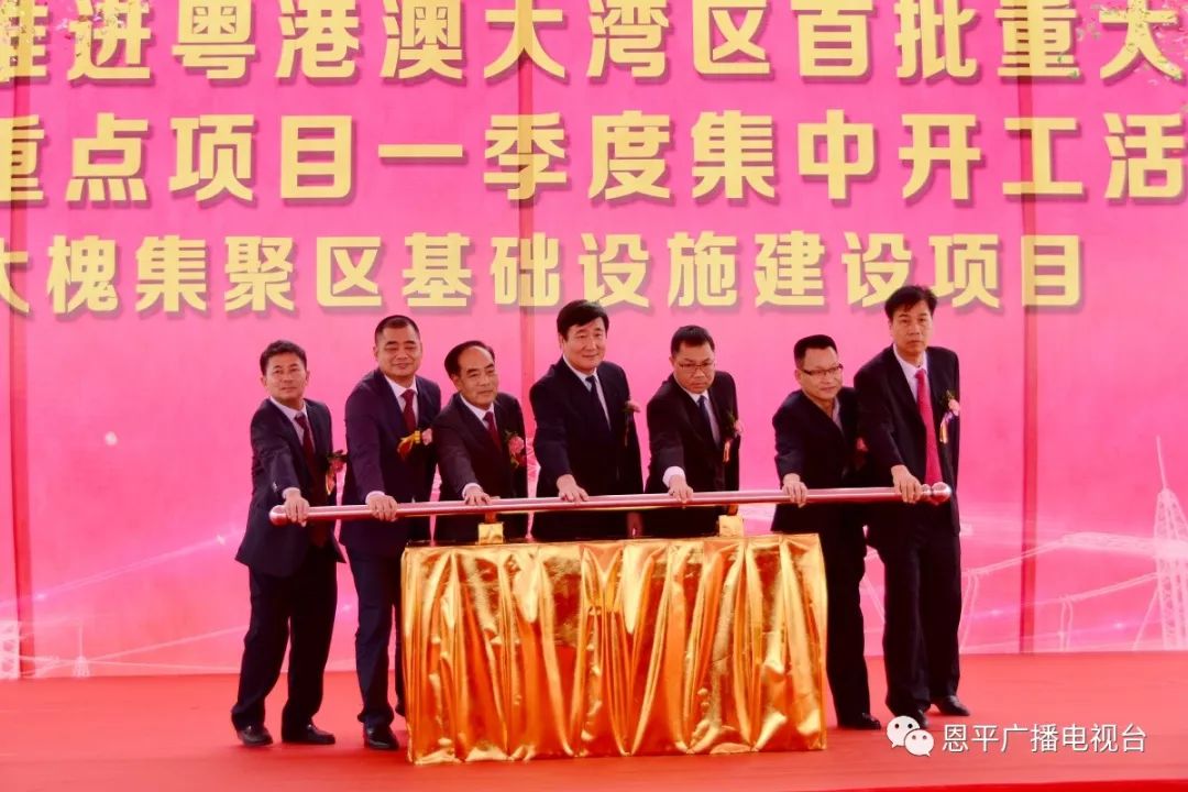 江门市政协副主席费伟东,恩平市委书记谢超武,江门市发展和改革局副局长姚益平,恩平市领导禤缵灵、郑成博、岑仲平、岑安林出席大槐集聚区基础设施建设项目开工仪式。