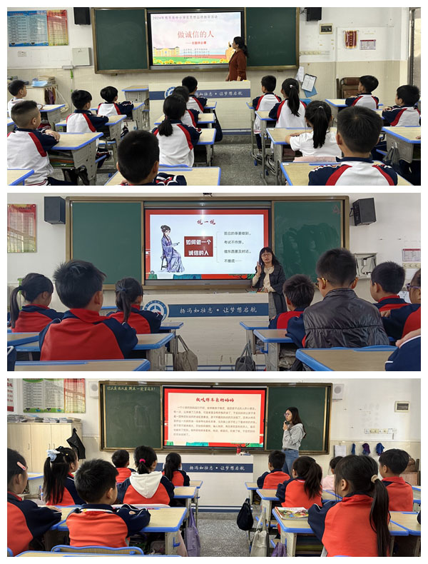 学校政教处组织布置各班开展“做诚信的人”主题班会课,对学生进行诚信主题教育,并让学生畅所欲言,寻找自身在诚信方面的缺失,然后通过组织讲诚信故事、分享诚信名言等多种方式,强化诚信意识。在各班班主任的精心组织下,主题班会开得有声有色。