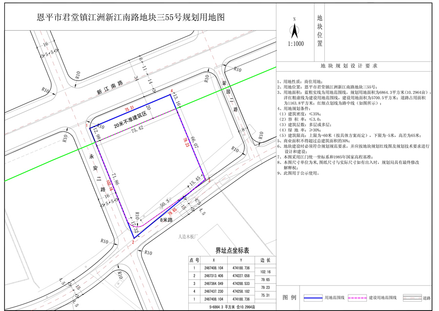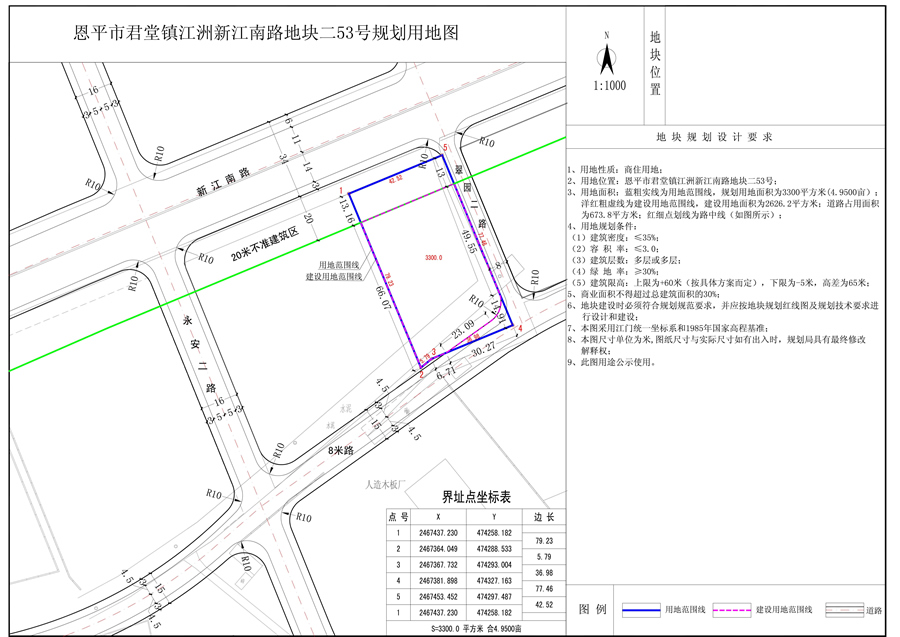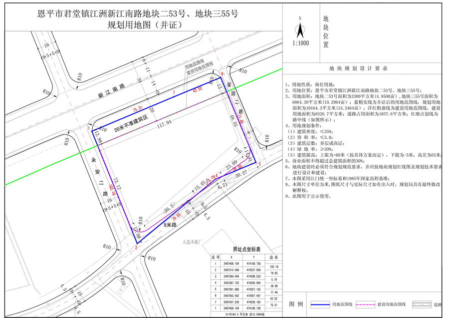 2、用地规模:10164.3平方米(15.2464亩)。其中恩平市君堂镇江洲新江南路地块二53号用地面积为3300平方米,恩平市君堂镇江洲新江南路地块三55号用地面积为6864.3平方米。