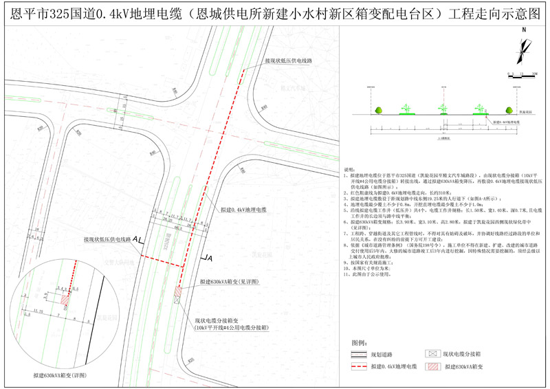 该项目位于恩平市325国道(凯旋花园至精文汽车城路段),由现状电缆分接箱(10kV平开线#4公用电缆分接箱)转接出线,通过拟建630kVA箱变降压,再敷设0.4kV地埋电缆接现状低压供电线路(如图所示)。拟建地埋电缆总长约310米;沿线拟建电缆工作井(低压井)共4个,电缆工作井规格:长1.50米、宽1.40米、深0.7米, 且电缆工作井的长边须与路中线平衡;拟建630kVA箱变规格:长3.90米、宽3.10米、高2.80米,拟建于凯旋花园西侧现状绿化带中。