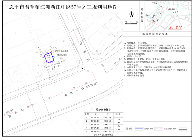 该地块位于恩平市君堂镇江洲新江中路(325国道)57号,用地性质为商住用地,用地面积为240.0平方米(0.3600亩)。现开发单位申请将该地块分为三块用地,其中57号之一用地面积为112.0平方米(0.1680亩);57号之二用地面积为80.0平方米(0.1200亩);57号之三用地面积为48.0平方米(0.0720亩);分证后用地性质均不变,用地性质仍为商住用地。符合《恩平市君堂镇镇区总体规划(2009--2028)》,现给予公示。
