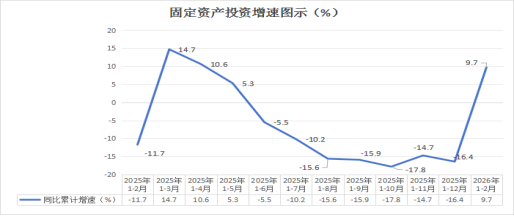 二、固定资产投资。1—2月,全市固定资产投资同比增长9.7%。其中,第一产业投资增长108.5%;第二产业投资增长38.5%;第三产业投资下降13.7%。