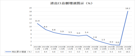 四、外贸进出口。1—2月,实现外贸进出口总值8.8亿元,同比增长18.2%。其中,出口7.6亿元,同比增长15.8%;进口1.2亿元,同比增长35.7%。