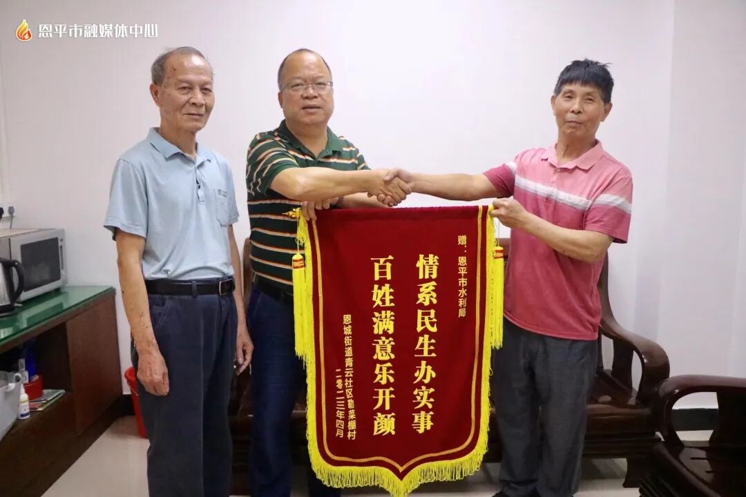 “情系民生办实事,百姓满意乐开颜!锦旗上的内容切切实实体现了我们的心声!”4月28日,恩城街道青云社区勒菜棚村村民代表来到市水利局,向工作人员送上锦旗,对他们为村里安装路灯表示感谢。