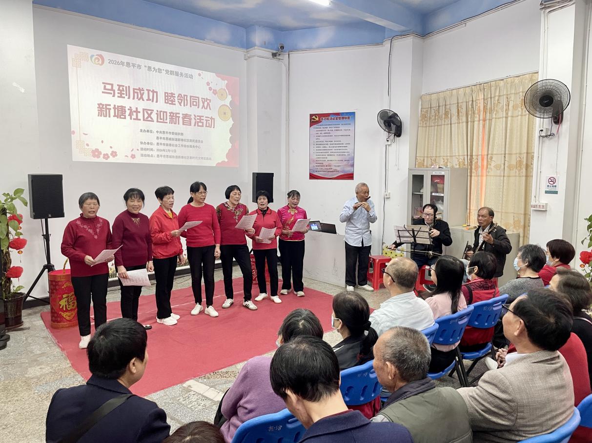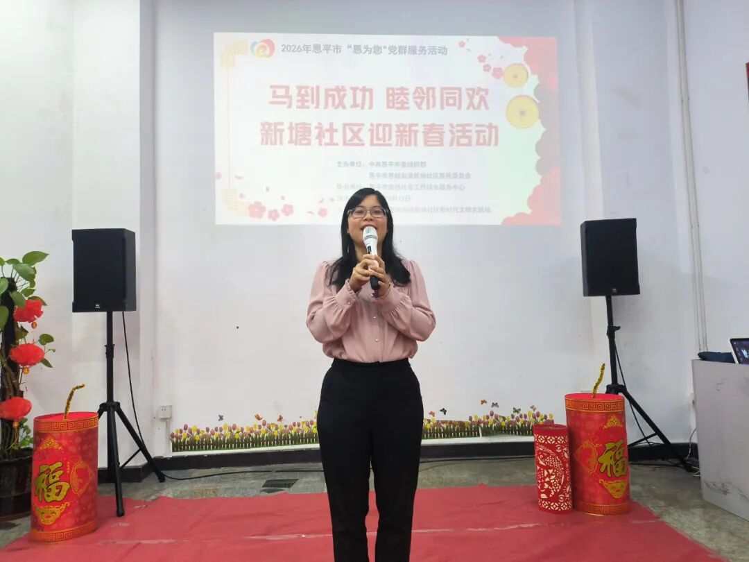 骏马奔腾迎新春,睦邻同欢庆佳节。为弘扬中华优秀传统文化,营造喜庆祥和的节日氛围,增进社区邻里情感,2026年2月12日,恩平市恩城街道新塘社区精心组织开展了以“马到成功·睦邻同欢”为主题的迎新春庆祝活动。活动内容丰富,形式多样,集精彩演出、趣味互动与暖心关怀于一体,为社区居民献上了一场充满年味、人情味和文化味的新春盛宴。