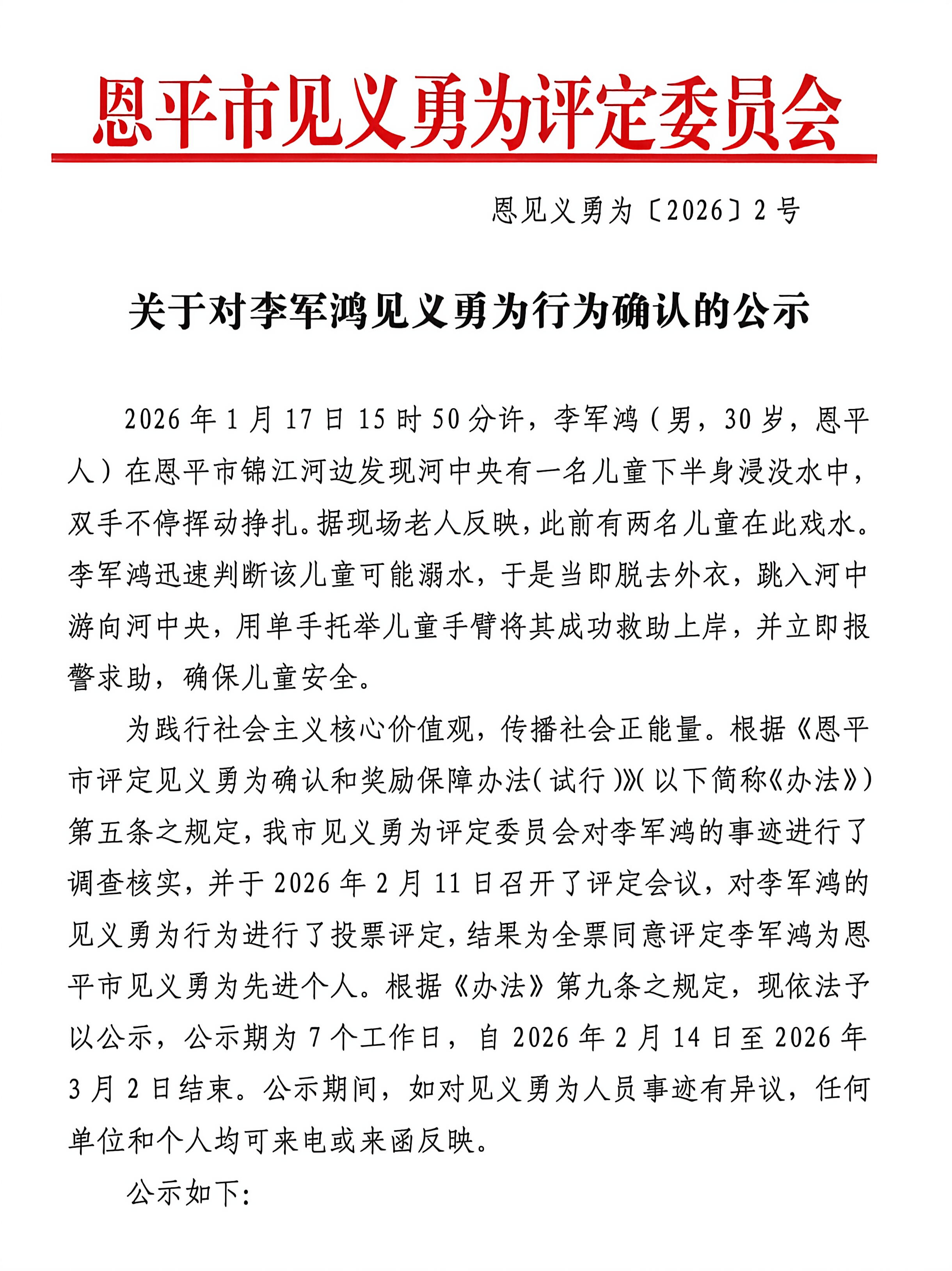 为践行社会主义核心价值观,传播社会正能量。根据《恩平市评定见义勇为确认和奖励保障办法(试行)》(以下简称《办法》)第五条之规定,我市见义勇为评定委员会对李军鸿的事迹进行了调查核实,并于2026年2月11日召开了评定会议,对李军鸿的见义勇为行为进行了投票评定,结果为全票同意评定李军鸿为恩平市见义勇为先进个人。根据《办法》第九条之规定,现依法予以公示,公示期为7个工作日,自2026年2月14日至2026年3月2日结束。公示期间,如对见义勇为人员事迹有异议,任何单位和个人均可来电或来函反映。