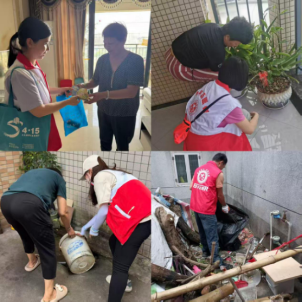 围绕蚊媒防控核心任务,市供销社从精准入户指导与 社区环境整治两方面重点推进:一方面严保入户质量,深化防疫与诚信双传递。工作人员深入社区开展入户宣传,逐户上门发放《告市民健康书》等宣传资料和灭蚊片,现场指导实操,针对水生植物、花盆托盘、废旧容器、下水道口等蚊虫孳生关键区域,手把手教居民清理积水、规范存放杂物,在提升群众自我防护意识的同时,传递诚信共建理念;另一方面深入社区,从源头减少蚊虫孳生。市供销社主动对接社区,针对社区里街暗巷、房前屋后、绿化带、闲置地等容易滋生蚊虫的重点区域开展倒积水、清杂物和清垃圾,同时,对绿化带灌木丛中的废弃一次性胶杯、食品袋、饭盒、枯叶等易积水的垃圾进行细致清理,有效减少蚊媒孳生环境。