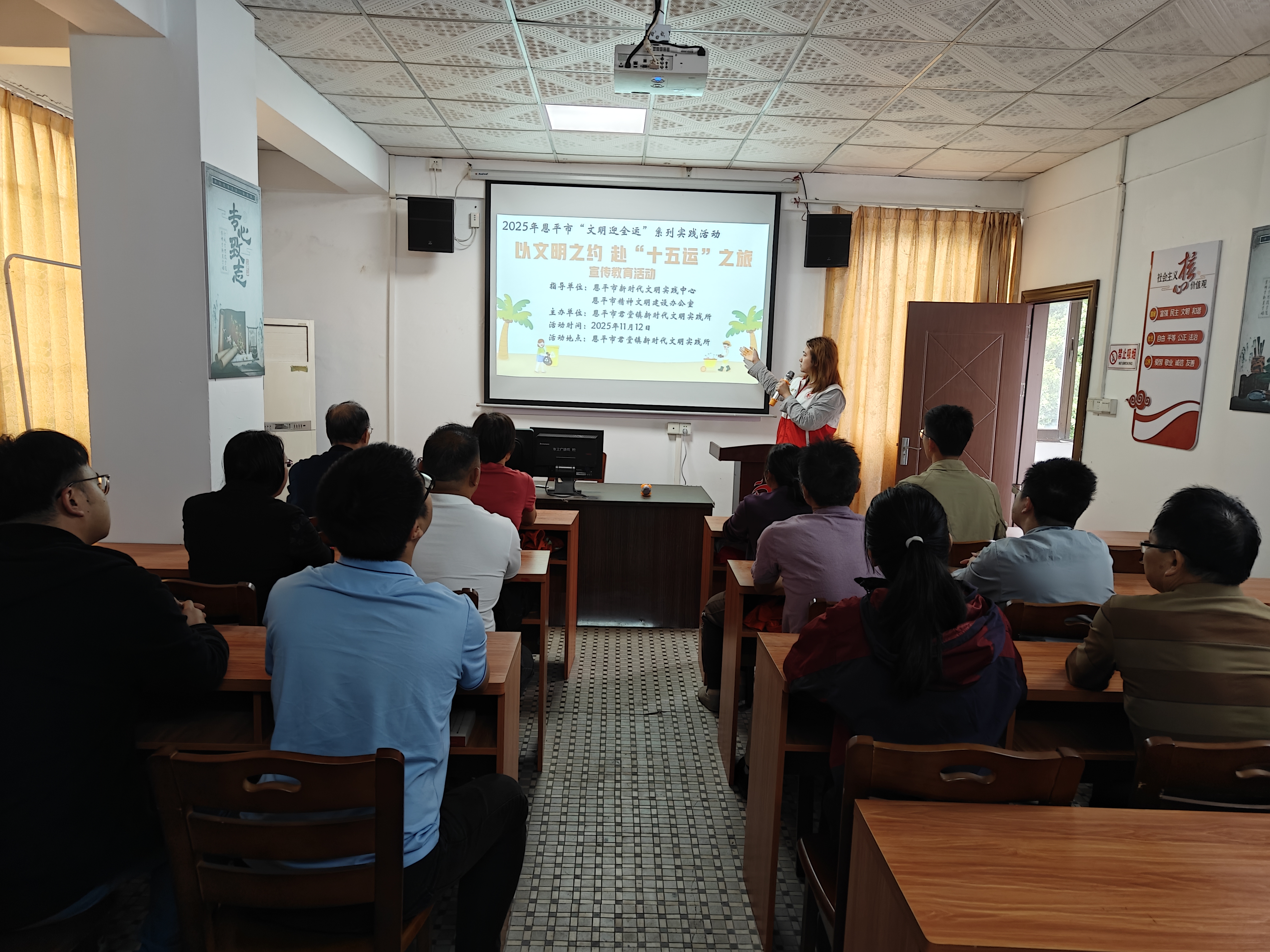 为推动第十五届全国运动会顺利举办,积极营造安全有序、文明和谐的旅游氛围,引导广大群众和游客践行文明旅游理念,以主人翁的姿态投身于文明出行的实践与示范中。11月12日,恩平市精神文明建设办公室联合君堂镇新时代文明实践所开展“以文明之约,赴‘十五运’之旅”宣传教育活动,以实际行动助力赛事的成功开展。
