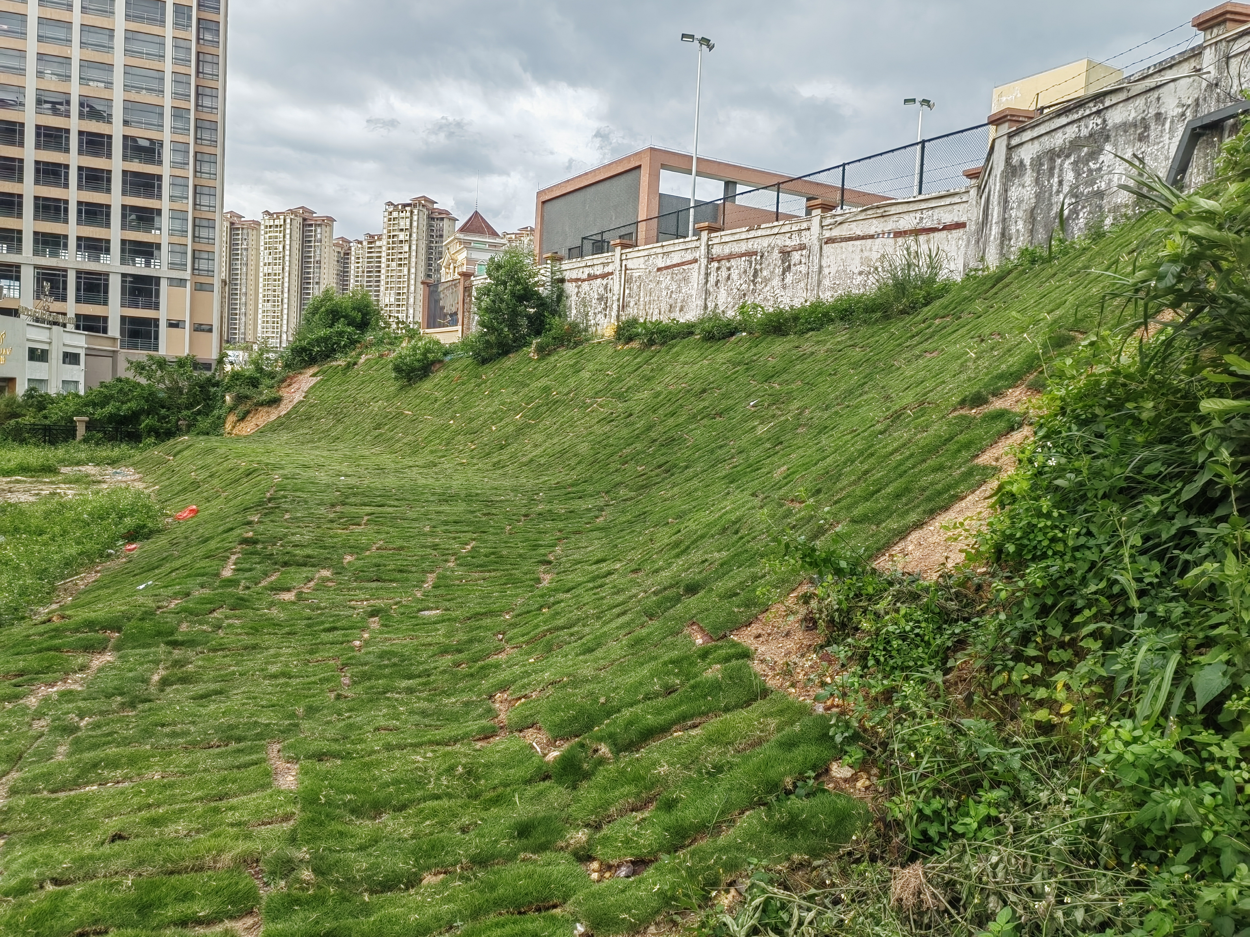 在东安社区的大力支持下,社区协调花木场专业技术人员到现场实地勘测、精准测量,结合边坡土质、坡度等实际情况,量身定制生态复绿方案,确定以种植固土能力强、成活率高的台湾草,既有效保持水土、消除安全隐患,又美化周边环境。