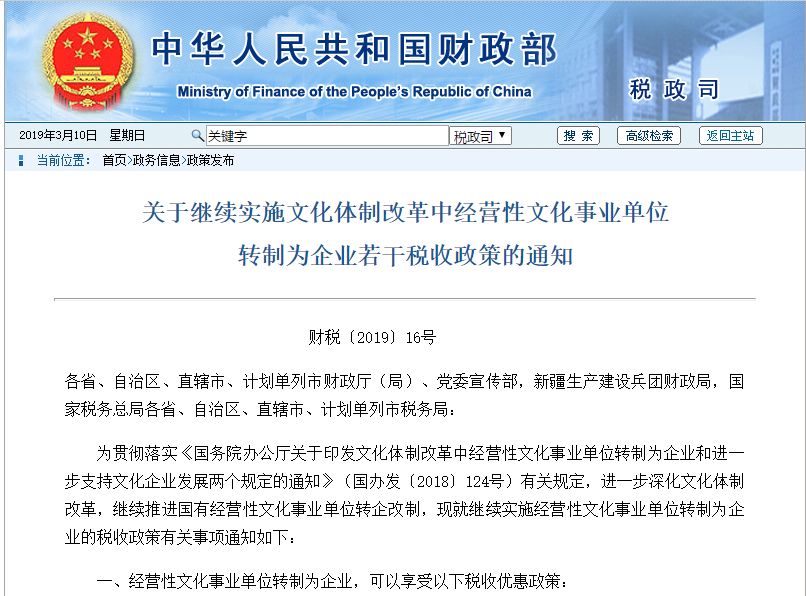 (一)经营性文化事业单位转制为企业,自转制注册之日起五年内免征企业所得税。2018年12月31日之前已完成转制的企业,自2019年1月1日起可继续免征五年企业所得税。