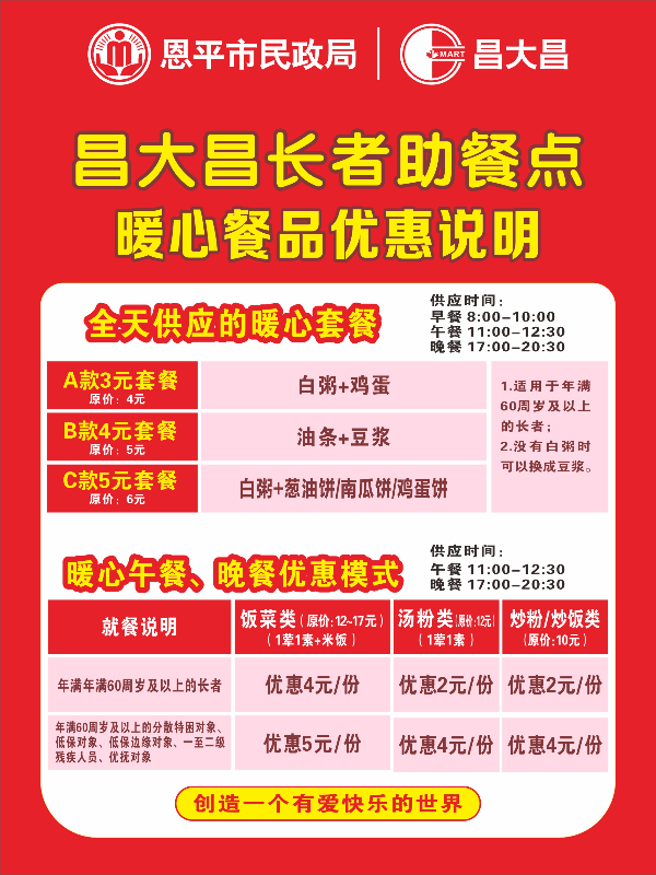 年满60周岁及以上的长者,持身份证等有效证件即可享受优惠。“助餐点全天供应,所有菜品低盐低糖、软烂可口,食材可溯源,确保老人‘舌尖上的安全’。”江门市昌大昌超级购物广场恩平店店长杜嘉航表示,接下来还将不断丰富菜品,为长者们提供更舒适美味的就餐体验。