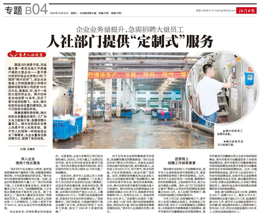 得知锦兴纺织的人才招聘需求后,恩平市人社局积极协助开展招聘工作,甚至将招聘信息带到了贵州的招聘会。此外,恩平市人社局还将进一步收集、整理锦兴纺织的招聘信息,上挂到相关平台,助力企业开展线上招聘。其中,在“江门日报恩平记者站”微信公众号发布的招聘信息浏览量过8000人次。在人社部门的帮助下,锦兴纺织的招聘工作顺利推进中。