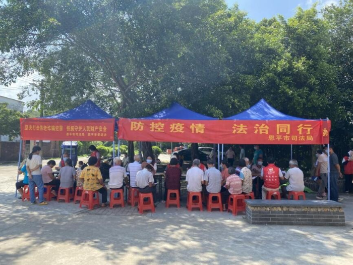 加强法治宣传,助力乡村振兴。为深化农村法治宣传教育,优化农村法治服务,恩平市司法局联合市农业农村局开展乡村法治宣传,助力乡村振兴发展。普法志愿者们通过悬挂宣传横幅、发放宣传单、现场答疑解惑等形式,向村民们宣传民法典、养老防诈等知识,积极引导人民群众无事学法、有事找法、遇事用法,号召大家做遵纪守法的好公民,将法治“和风”带到田间地头。将法治宣传带到基层,让法治春风沁润群众心里,让法治为乡村振兴助力。