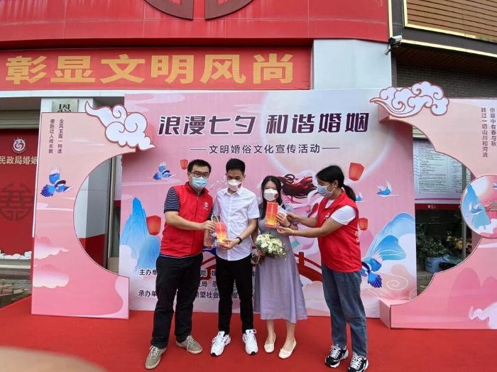送你一‘典’爱”为主题的法治宣传。普法志愿者为步入婚姻殿堂的新人们派发《民法典》《反家庭暴力法》《家庭教育促进法》宣传手册,讲解婚姻家庭中的法律小知识,并送上充满七夕节祝福心意的小礼品。在送去“七夕”节日问候的同时,也捎去法治的浪漫祝福,积极弘扬法治精神,倡导法治理念,在传统节日抹上“法治色彩”。