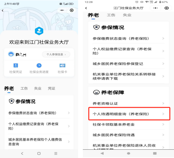 4.下划屏幕至“养老保障”模块,选择“个人待遇明细查询(养老保险)”服务;