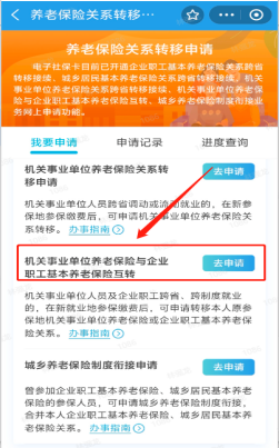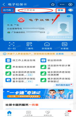 第一步:打开微信“电子社保卡”小程序并登录,左上角地区选择“江门市”——在搜索框输入【养老保险关系转移】并点击【搜索】——在【我要申请】模块选择【机关事业单位养老保险与企业职工基本养老保险互转】。