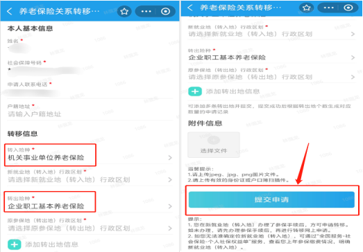 第二步:填写本人基本信息和转移信息及上传附件信息——选择【提交申请】。