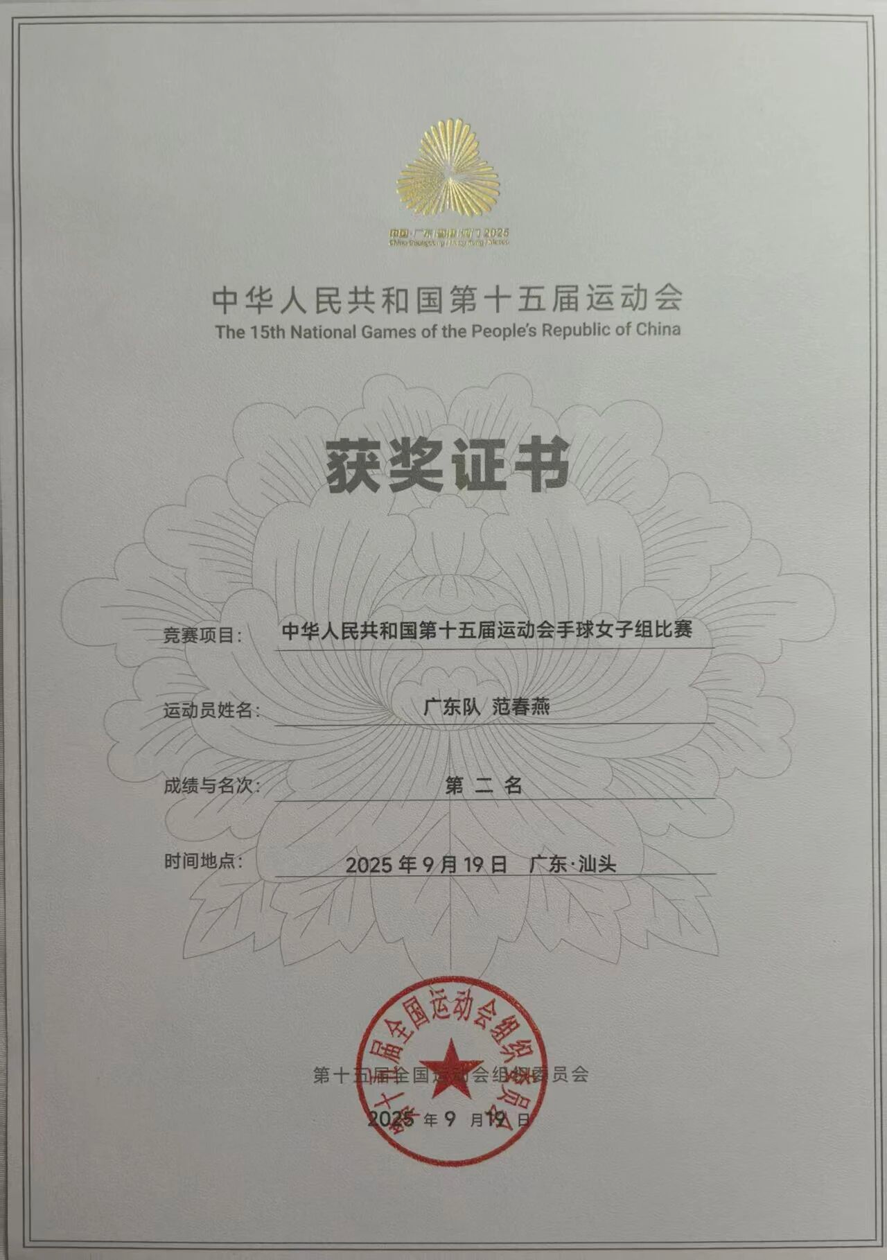 来自恩平市体育学校的国家级运动健将范春燕,作为广东女子手球队成员征战第十五届全运会,助力队伍夺得女子手球项目亚军,刷新了广东女手全运会历史最佳战绩。