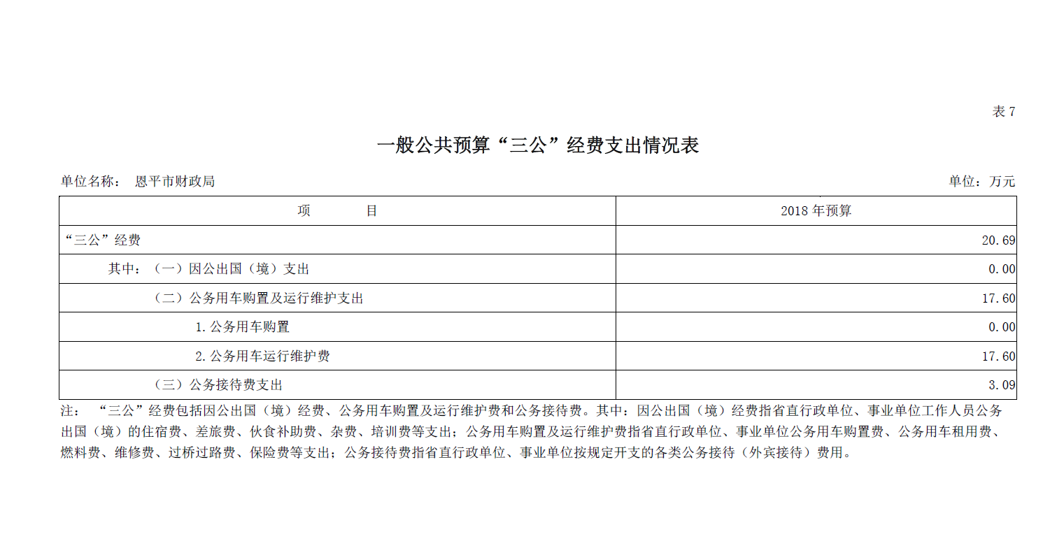 2018年本部门“三公”经费预算安排20.69万元,比上年减少1.07万元,下降4.92%,主要原因是加强公务车管理,严格控制接待业务,厉行节俭作风。其中:因公出国(境)费0.00万元,与上年保持不变;公务用车购置及运行费17.60万元,比上年减少0.05万元,下降0.28%,主要原因是加强公务车管理;公务接待费3.09万元,比上年减少1.02万元,下降24.82%,主要原因是严格控制接待支出,厉行节俭作风。