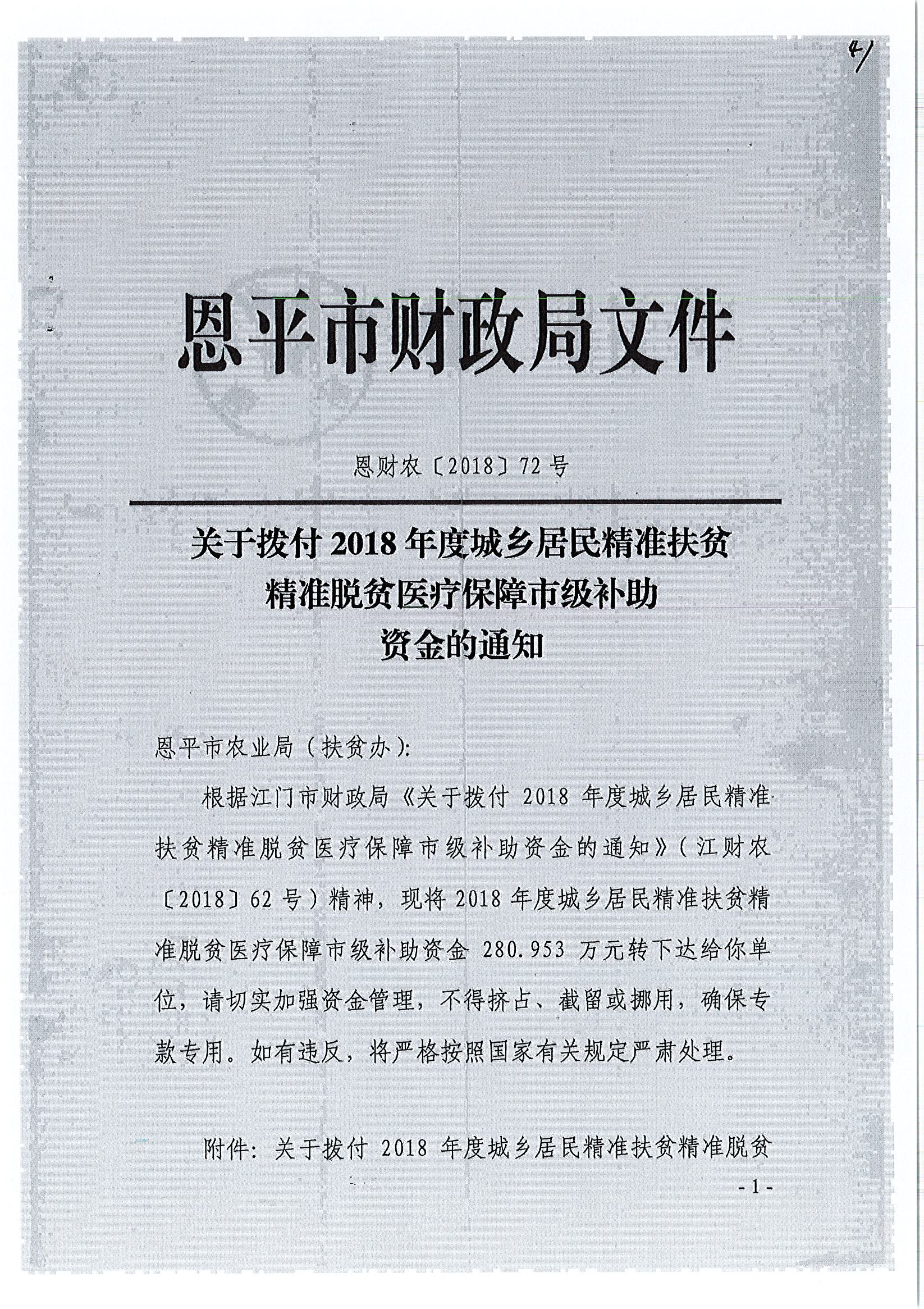 关于拨付2018年度城乡居民精准扶贫精准脱贫医疗保障市级补助资金的通知