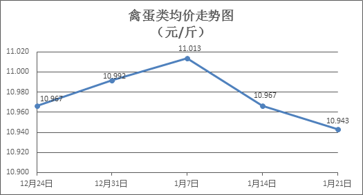 禽蛋类商品价格略有下降。上周所监测的6种禽蛋类商品价格波动情况为1涨3跌2平,综合零售均价为10.943元/斤,环比下降0.21%。其中:白条鸡、白条鸭零售均价分别为每斤20.09元、15.11元,环比分别持平、下降0.33%;白壳鸡蛋、鸭蛋零售均价分别为每斤6.72元、7.70元,环比分别下降0.59%、下降1.03%。