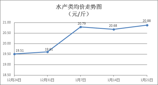 水产类商品价格总体略涨。上周所监测的10种水产商品价格波动情况为7涨2跌1平,综合均价为20.88元/斤,环比上涨0.97%。其中:草鱼、鲫鱼、罗非鱼、基围虾零售均价分别为每斤11.11元、13.68元、8.64元、34.50元,环比分别上涨0.09%、上涨0.15%、持平、上涨0.94%。