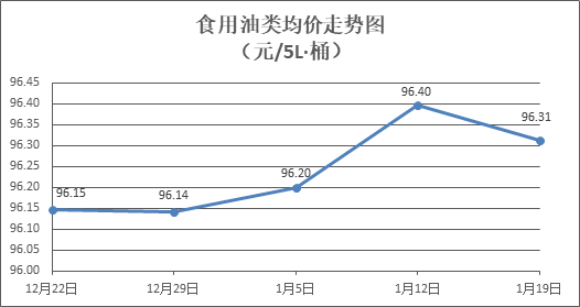 食用油类商品价格微幅盘整。所监测的9种食用油(5L装)商品价格波动情况为5涨2跌2平,综合零售均价为每桶96.31元,环比下降0.09%。其中:金龙鱼花生油、玉米油零售均价为每桶103.26元、76.74元,环比分别下降0.05%、上涨0.05%。