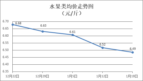 水果类商品价格总体略降。所监测的6种水果商品价格波动情况为1涨3跌2平,综合零售均价为每斤6.49元,环比下降0.46%。其中橙子、苹果、葡萄零售均价分别为每斤5.70元、7.23元、13.77元,环比分别下降2.06%、下降0.14%、持平。