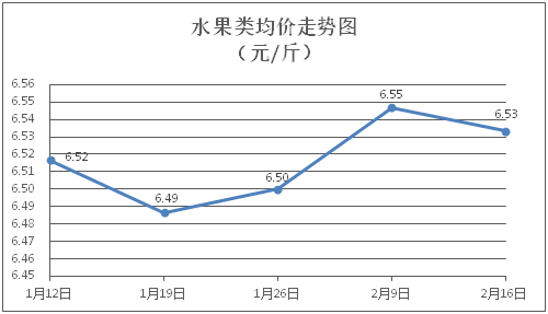 水果类商品价格微幅下降。所监测的6种水果商品价格波动情况为1涨4跌1平,综合零售均价为每斤6.53元,环比下降0.20%。其中橙子、香蕉、葡萄零售均价分别为每斤5.90元、3.18元、13.58元,环比分别上涨0.85%、下降1.24%、下降0.37%。
