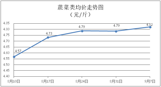蔬菜类商品价格总体略涨。所监测的32 种蔬菜商品价格波动情况为17涨11跌4平,综合零售均价为每斤4.82元,环比上涨0.74%。其中:涨幅居前的品种包括黄瓜、芥兰、西芹,零售均价分别为每斤4.53元、5.80元、5.05元,环比分别上涨8.11%、2.65%、2.64%;跌幅靠前的品种包括苦瓜、水东芥菜、菠菜,零售均价分别为每斤5.13元、4.57元、7.17元,环比分别下降0.97%、0.87%、0.69%。