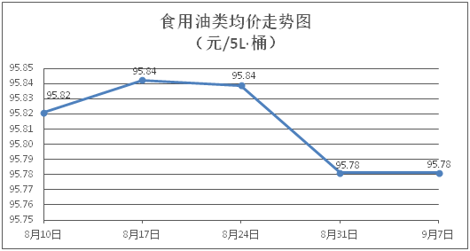 食用油类商品价格平稳。所监测的9种食用油(5L装)商品价格均持平,综合零售均价为每桶95.78元。其中:金龙鱼花生油、大豆油零售均价分别为每桶102.38元、61.50元,环比均持平。
