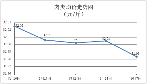 肉类商品价格微幅下降。所监测的8种肉类商品价格波动情况为1涨6跌1平,综合零售均价为每斤31.98元,环比下降0.07%。其中:排骨、精瘦肉、牛肉、带骨羊肉零售均价分别为每斤30.23元、18.87元、46.29元、42.01元,环比分别下降0.30%、下降0.16%、持平、下降0.10%。