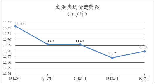 禽蛋类商品价格微幅波动。所监测的5种禽蛋类商品价格波动情况为2涨2跌1平,综合零售均价为每斤11.68元,环比上涨0.10%。其中:白条鸡、白条鸭零售均价分别为每斤20.79元、15.17元,环比分别上涨0.34%、下降0.20%;鸡蛋、鸭蛋零售均价分别为每斤6.34元、7.06元,环比分别上涨0.48%、下降0.14%。