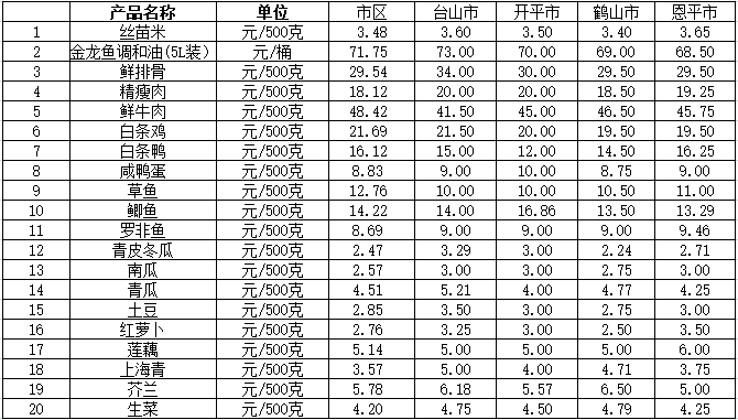 说明:1、表中价格为该地区监测点上周综合平均价;2、“市区”含蓬江区、江海区、新会区,价格分别采自蓬江市场、江南市场、城东市场等13家农贸市场;3、其他四个县市价格分别采自新华市场、锦江市场等8家农贸市场。
