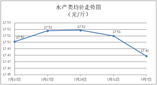 水产类商品价格走势偏弱。所监测的9种水产商品价格波动情况为2涨6跌1平,综合均价为每斤17.48元,环比下降0.18%。其中:草鱼、鲫鱼、罗非鱼、基围虾零售均价分别为每斤11.40元、14.32元、8.92元、29.33元,环比分别下降0.52%、上涨0.49%、下降0.22%、下降0.07%。