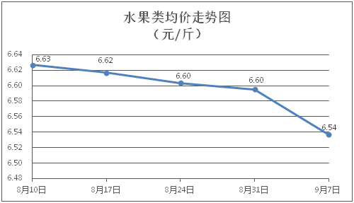 水果类商品价格涨跌互现。所监测的6种水果商品价格波动情况为3涨3跌,综合零售均价为每斤6.54元,环比下降0.88%。其中橙子、香蕉、葡萄零售均价分别为每斤7.18元、3.06元、12.87元,环比分别上涨2.13%、下降4.38%、下降2.87%。