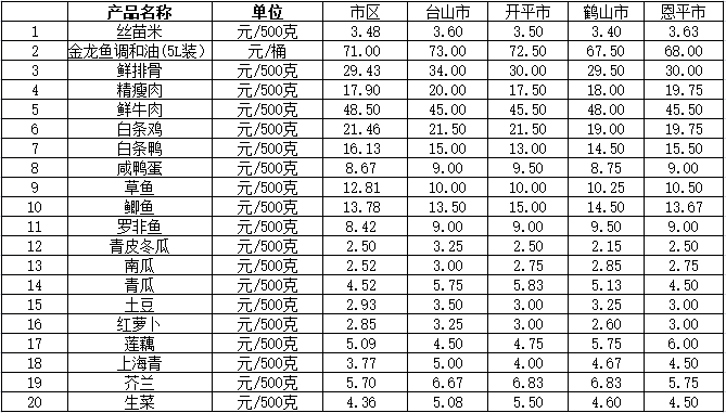 说明:1、表中价格为该地区监测点上周综合平均价;2、“市区”含蓬江区、江海区、新会区,价格分别采自蓬江市场、江南市场、城东市场等13家农贸市场;3、其他四个县市价格分别采自新华市场、锦江市场等8家农贸市场。