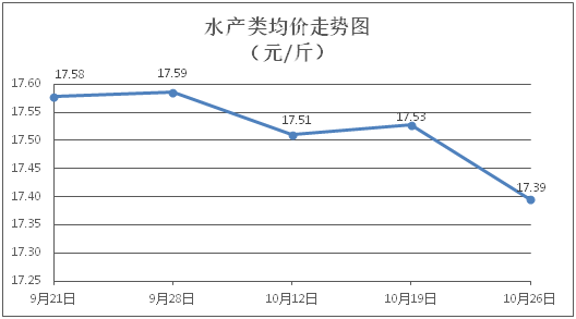 水产类商品价格总体略降。所监测的9种水产商品价格波动情况为3涨5跌1平,综合均价为每斤17.39元,环比下降0.76%。其中:草鱼、鳙鱼、鲈鱼、基围虾零售均价分别为每斤11.31元、10.61元、21.88元、28.97元,环比分别上涨0.18%、下降0.19%、下降0.55%、下降0.10%。