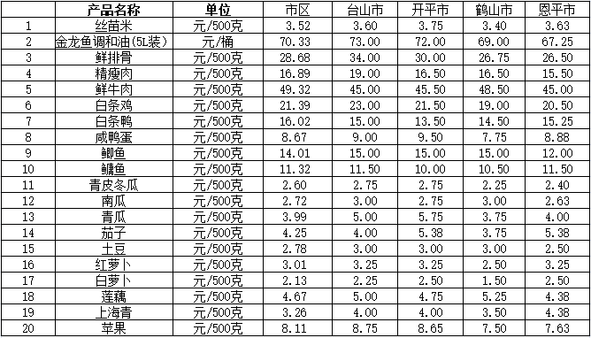 说明:1、表中价格为该地区监测点上周综合平均价;2、“市区”含蓬江区、江海区、新会区,价格分别采自蓬江市场、江南市场、城东市场等13家农贸市场;3、其他四个县市价格分别采自新华市场、锦江市场等8家农贸市场。