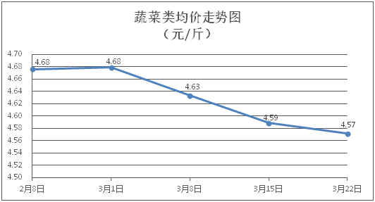 据本市21家农贸市场监测数据显示,上周(3月16日至3月22日)市场上各类“菜篮子”商品供应充足,所监测的7大类“菜篮子”商品价格与上周相比(环比)总体表现为1涨5跌1平。其中:粮油类商品价格基本平稳,肉禽蛋类、蔬菜类、水产类商品价格总体略降,水果类商品价格小幅上涨。